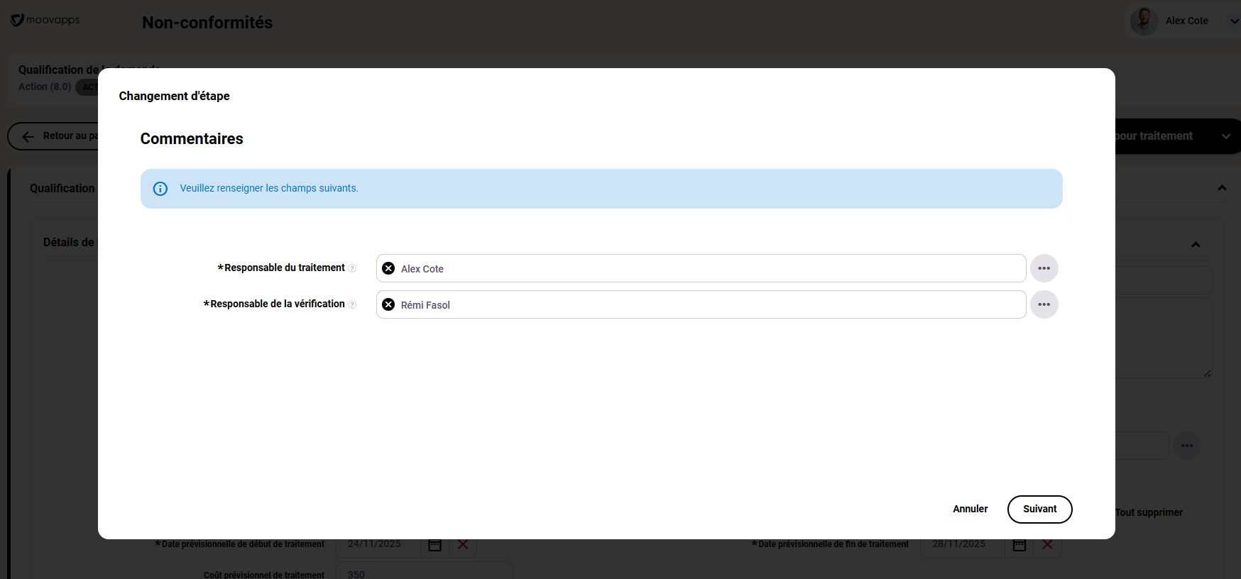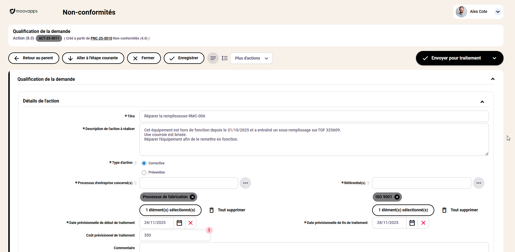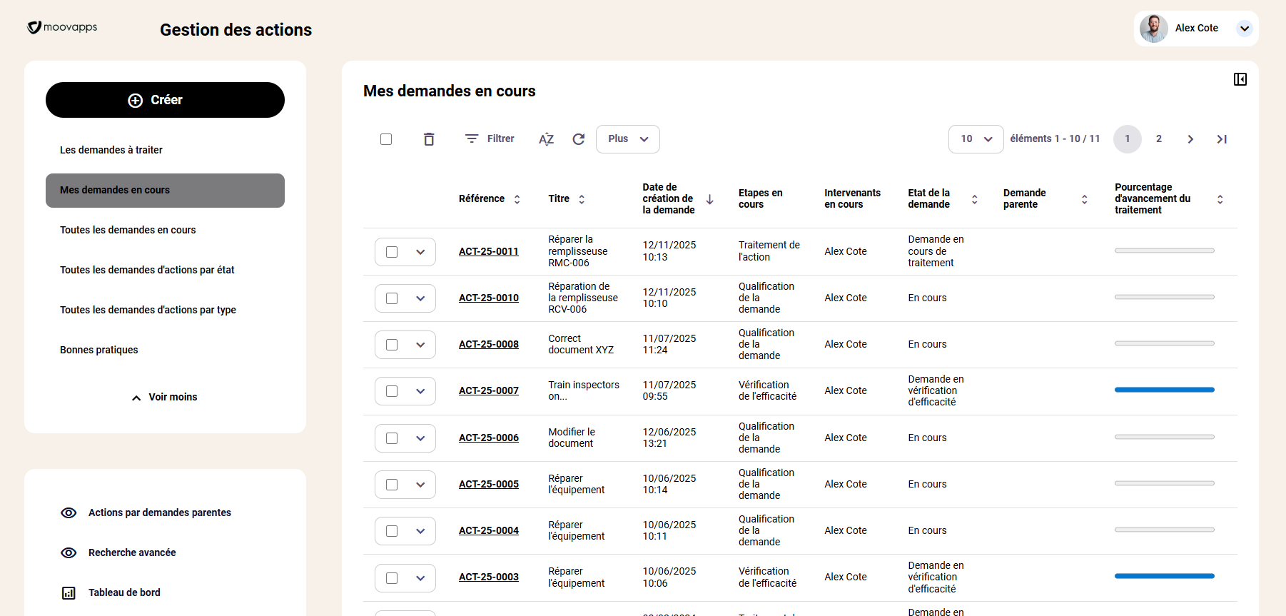 Exemple de l’interface pour la gestion des actions par l’utilisateur Alex Coté. Il est possible d’y faire des filtres et d’extraire sous format Excel. Cette fonctionnalité est particulièrement appréciée pour sortir des Indicateurs Clés de Performance (KPI)