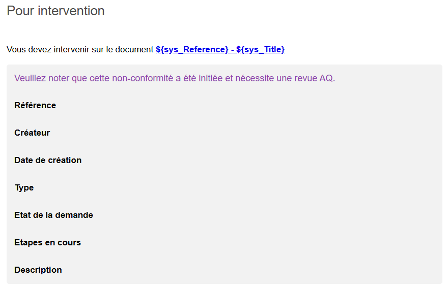 Exemple de courriel pour intervenir sur une non-conformité avec inclusion du lien pour y accéder et des champs que l’entreprise souhaite afficher